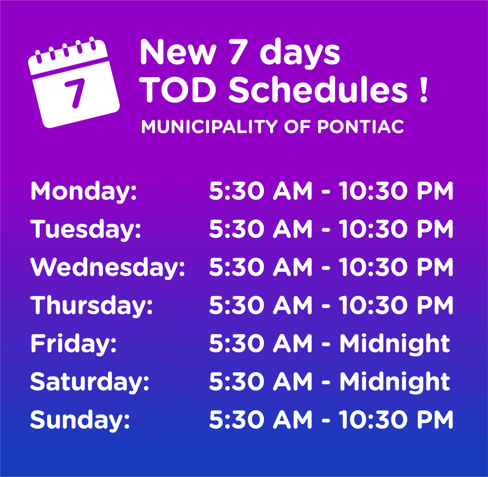 New schedule – Transcollines On-Demand (TOD) | Municipality of Pontiac Please note that the On-Demand Transport (TOD) service in the Municipality of Pontiac is now available 7 days a week. New schedule in effect: Sunday to Thursday: 5:30 a.m. to 10:30 p.m. Friday and Saturday: 5:30 a.m. to midnight Try it today! 👉 www.transcollines.ca/en/on-demand-service